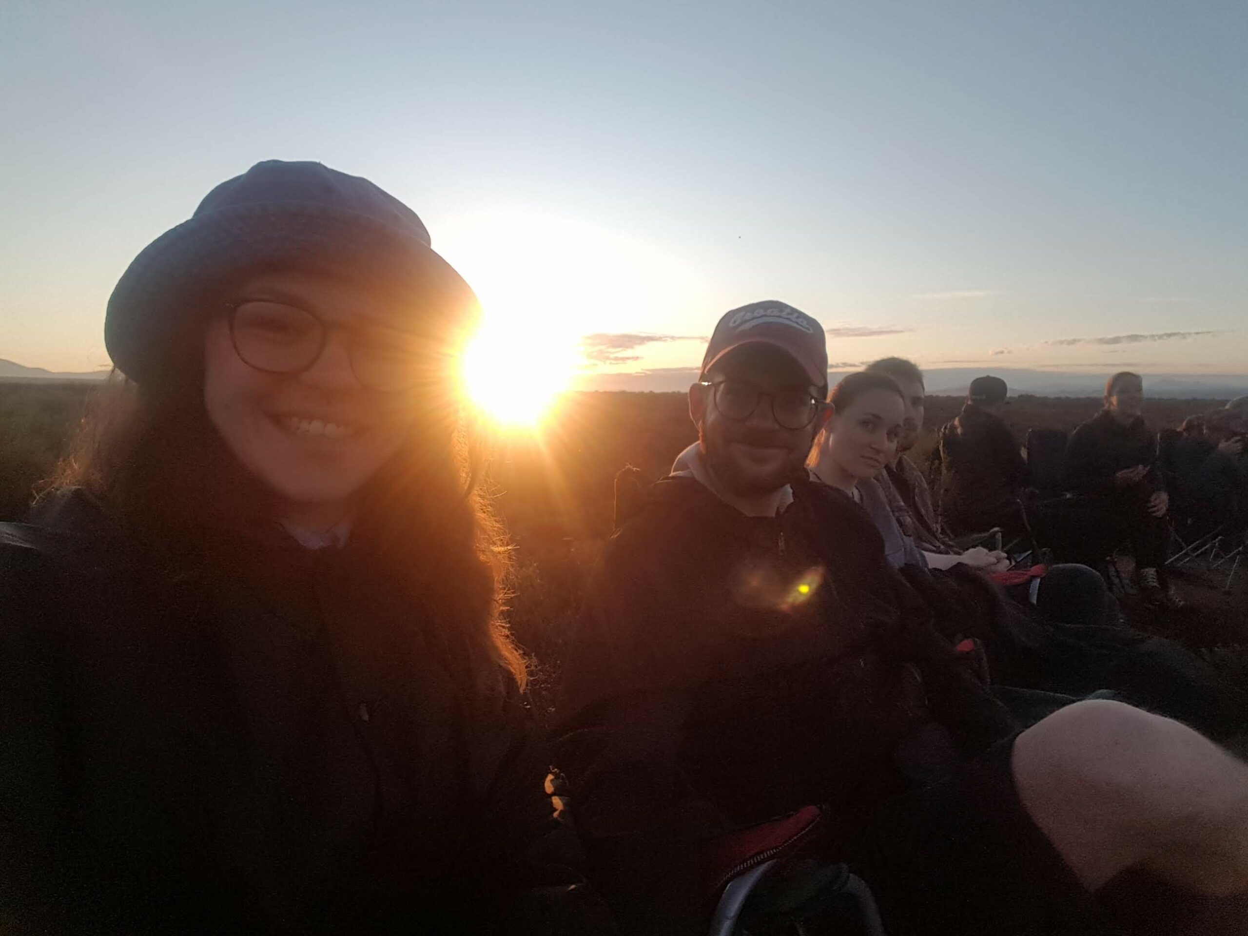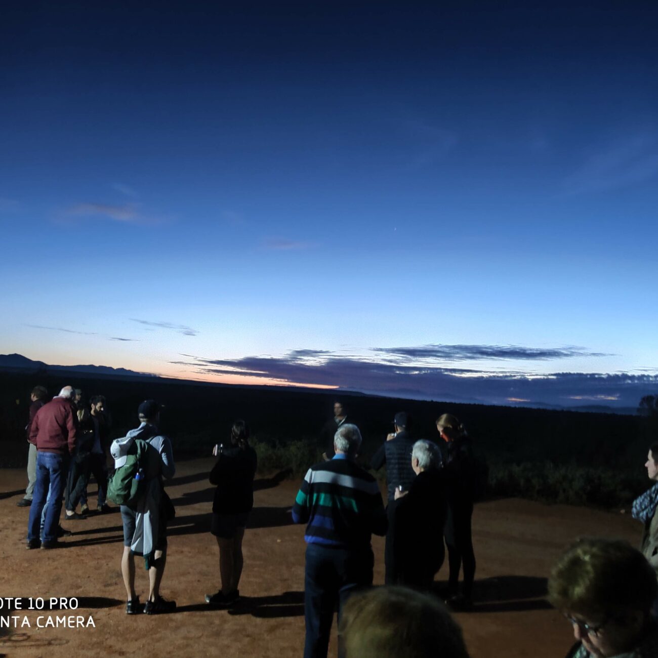 Das erste Mal um 5:00 Uhr aufstehen war angesagt. Wir trafen uns schon kurz vor 6 bei der Erdmännchenfarm, sag ich jetzt mal so, ein. Dort bekamen wir zunächst Kaffee und Kekse und begaben uns mit Klappstühlen kurz vor Sonnenaufgang aufs Feld, wo die Erdmännchen ihre Kanäle / Löcher in die Erde gebuddelt hatten und dann erstmal dort drinnen schlafen.